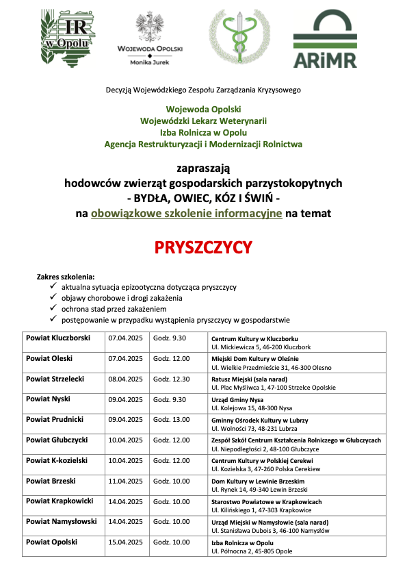 🐄🐑🐐🐖 15 kwietnia odbędzie się w Opolu obowiązkowe szkolenie informacyjne dla wszystkich hodowców zwierząt gospodarskich parzystokopytnych (bydła, owiec, kóz i świń) dotyczące pryszczycy.