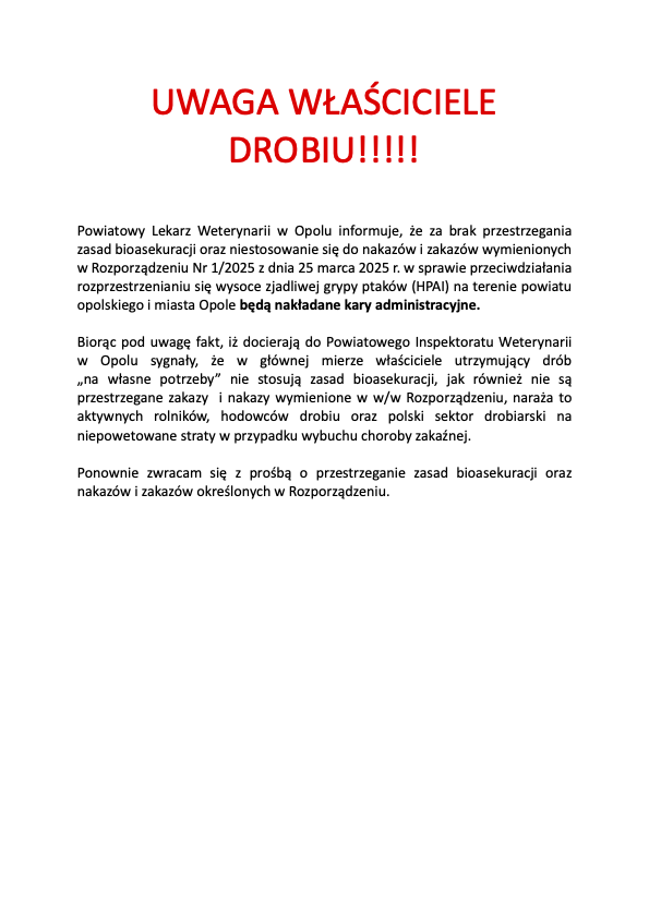 🐓🪿 Powiatowy Lekarz Weterynarii w Opolu informuje, że za brak przestrzegania zasad bioasekuracji oraz niestosowanie się do nakazów i zakazów wymienionych w Rozporządzeniu Nr 1/2025 z dnia 25 marca 2025 r. w sprawie przeciwdziałania rozprzestrzenianiu się wysoce zjadliwej grypy ptaków (HPAI) na terenie powiatu opolskiego i miasta Opole będą nakładane kary administracyjne.