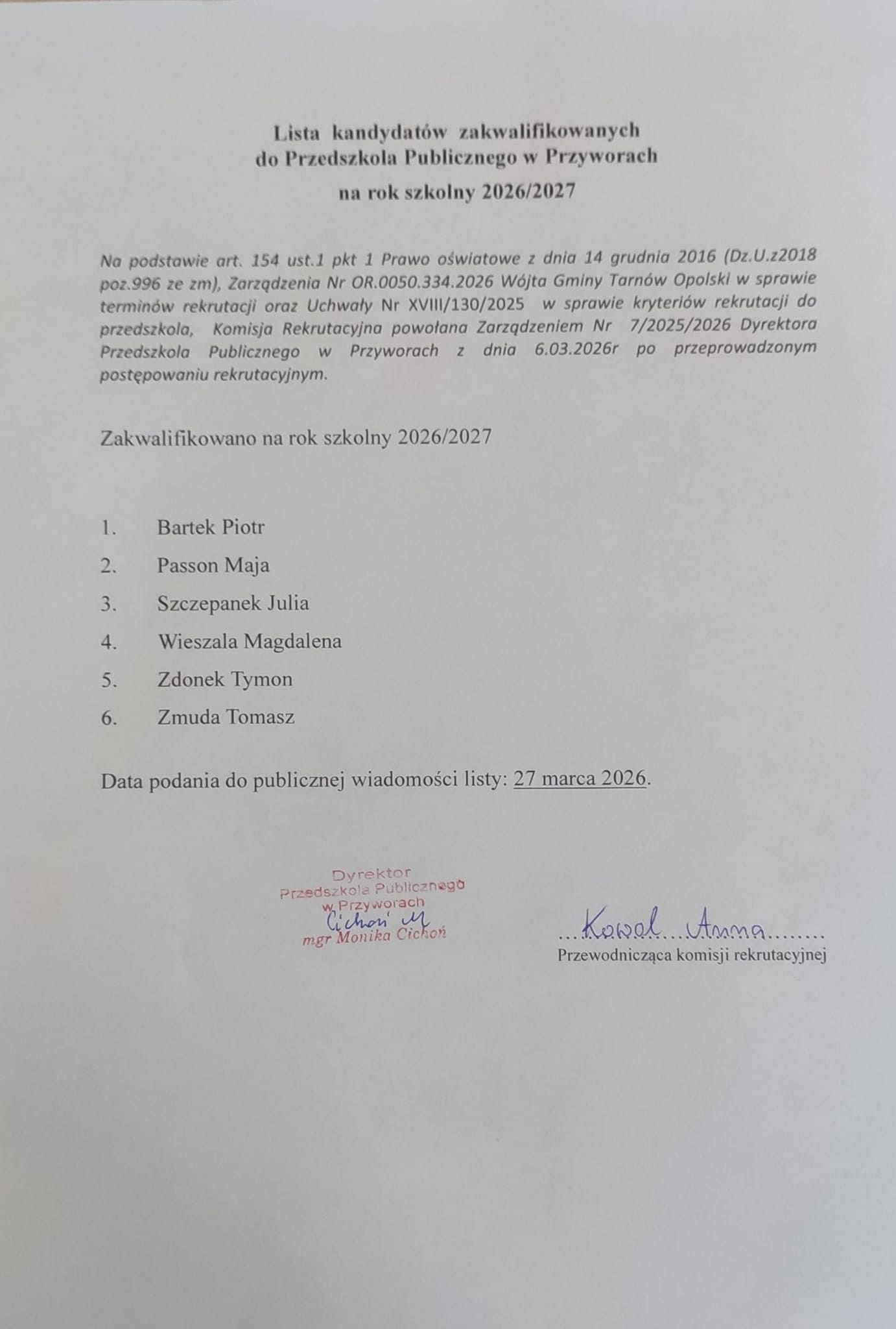 Lista kandydatów zakwalifikowanych do Przedszkola Publicznego w Przyworach